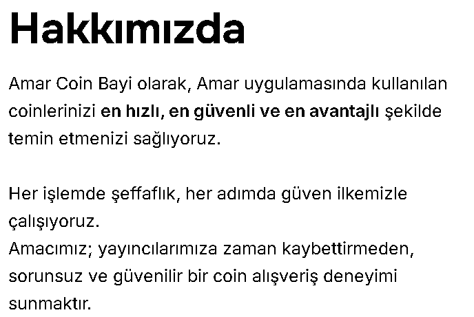 Amar dünyasında kesintisiz eğlence ve etkileşim için ihtiyacınız olan tüm coin desteği burada! AmarCoinBayi olarak, yayıncılar ve izleyiciler için en hızlı, en güvenli ve 7/24 kesintisiz hizmet sunan çözüm ortağınız olmayı hedefliyoruz. Gelişmiş altyapımız sayesinde ödemenizi yaptığınız anda coinleriniz saniyeler içinde hesabınıza tanımlanırken, avantajlı fiyatlarımız ve düzenli bonus kampanyalarımızla her zaman bir adım önde olmanızı sağlıyoruz. Profesyonel destek ekibimizle her an yanınızda olan güvenilir bir bayi deneyimi ve hızlı teslimat avantajıyla, dijital dünyadaki varlığınızı güçlendirmek için siz de topluluğumuza katılın.